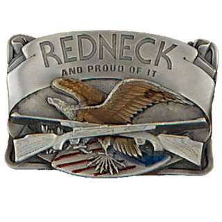Loading... Please wait..."Redneck and proud of it" is written boldly on this belt buckle. There is an eagle, two rifles and an American flag as well. This exquisitely carved buckle is made of fully cast metal with a standard bale that fits up to 2" belts. Buckle is enhanced with blue, red and brown enamel.